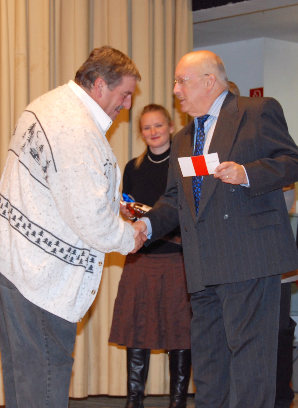 Festakt - Hannes Buchholz erhält vom Bezirksvorsitzenden Werner Schwanzer die Jugendleiterehrennadel in Bronze