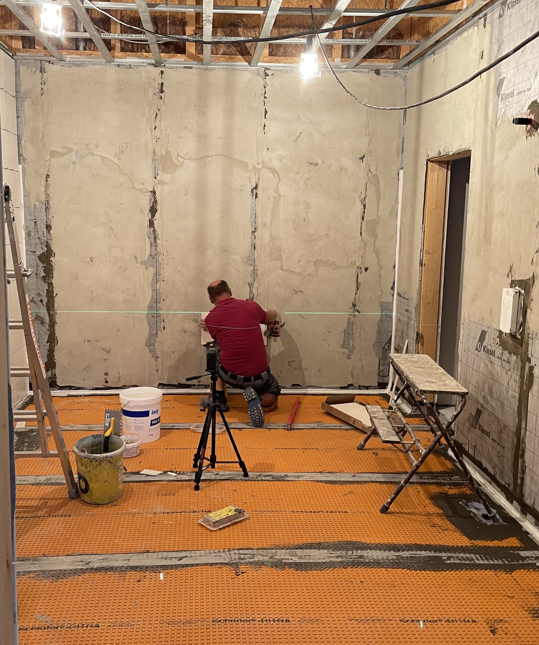 13.10.2023 - weitere Arbeiten (Rigipsplatten montieren, Leitungen verlgen, Kabinen spachteln, Maurerarbeiten)