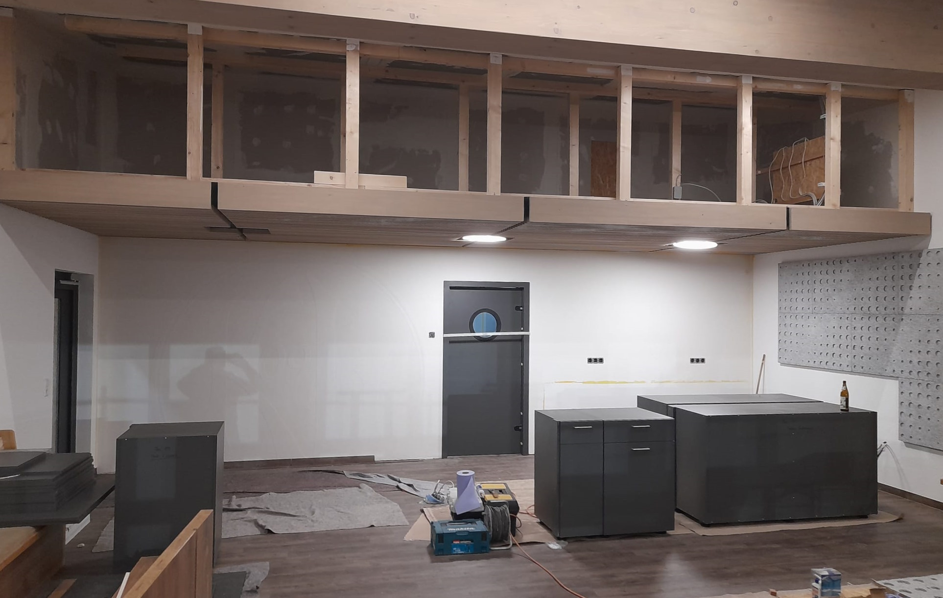 11.11.2023 - weitere Arbeiten (Rigipsplatten montieren, Elektroarbeiten, Lüftung, Kabinen spachteln, Bodenbeläge abholen)